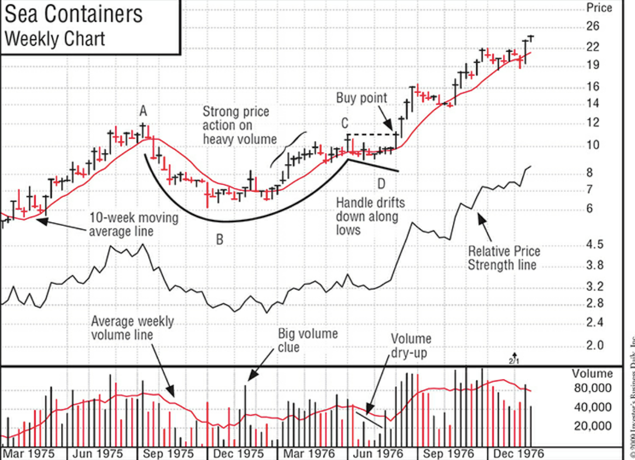 - “One of the most important price patterns looks like a cup with a handle when the outline of the cup is viewed from the side. Cup patterns can last from 7 weeks to as long as 65 weeks, but most of them last for three to six months. The usual correction from the absolute peak (the top of the cup) to the low point (the bottom of the cup) of this price pattern varies from around the 12% to 15% range to upwards of 33%. A strong price pattern of any type should always have a clear and definite price uptrend prior to the beginning of its base pattern. You should look for at least a 30% increase in price in the prior uptrend, together with improving relative strength and a very substantial increase in trading volume at some points in the prior uptrend. In most, but not all, cases, the bottom part of the cup should be rounded and give the appearance of a “U” rather than a very narrow “V.” This characteristic allows the stock time to proceed through a needed natural correction,
