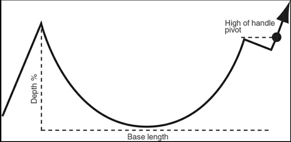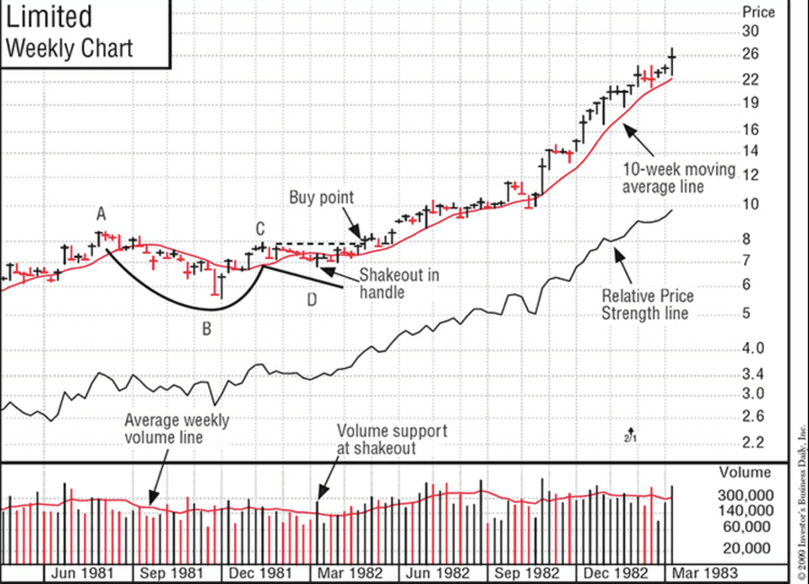 - “The formation of the handle area generally takes more than one or two weeks and has a downward price drift or “shakeout” (where the price drops below a prior low point in the handle made a few weeks earlier), usually near the end of its down-drifting price movement. Volume may dry up noticeably near the lows in the handle’s price pullback phase.”